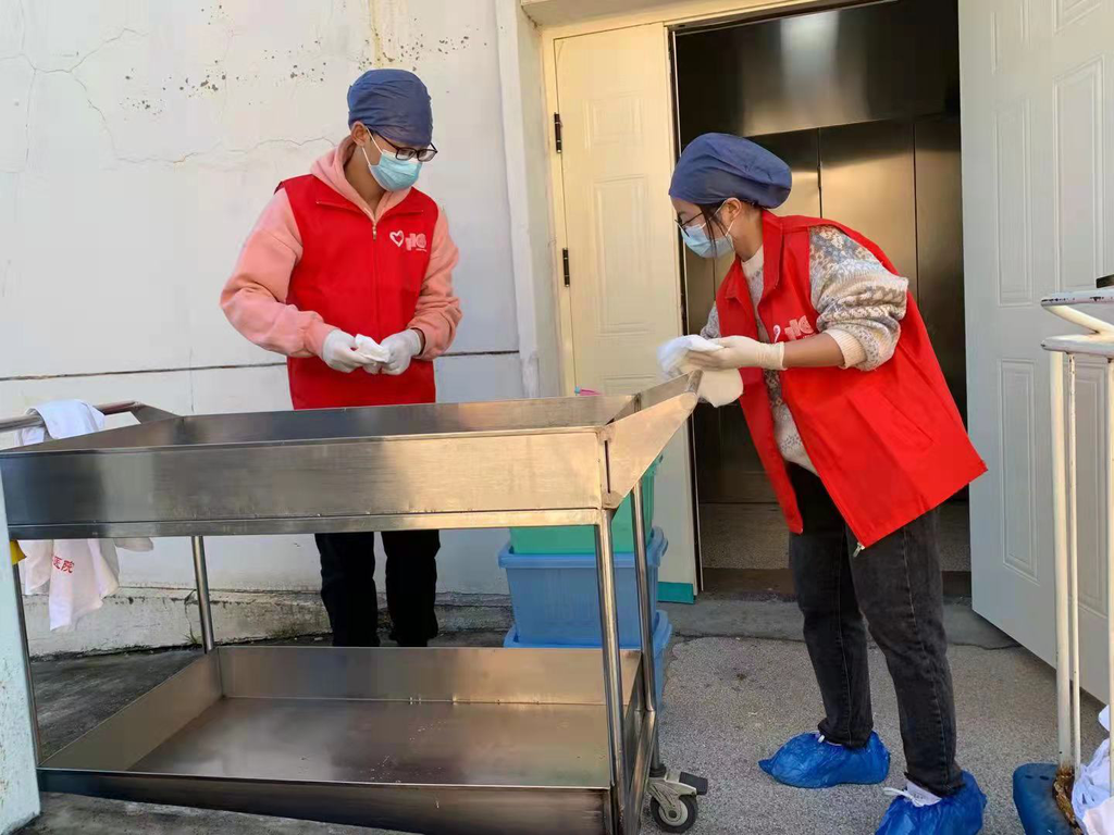 志愿者对校医院设备进行消毒