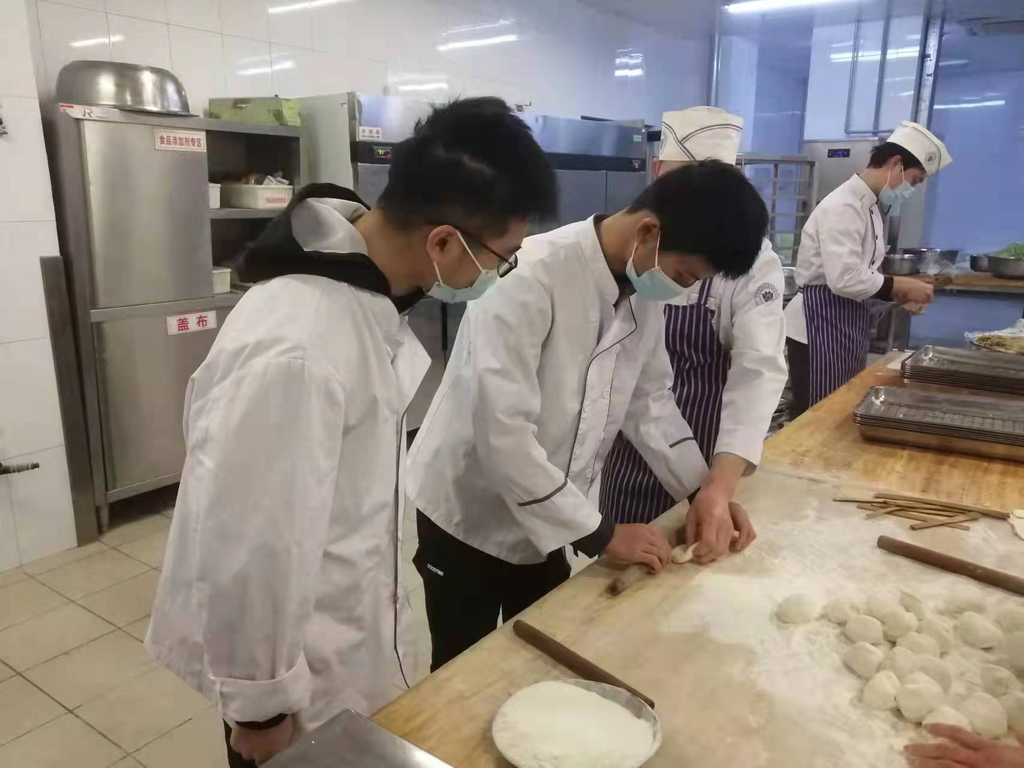接待服务中心开设的会议服务员岗位的劳动内容十分丰富,快速地学习一些会议接待服务的礼仪后,同学们在老师的带领下练习会场布置、倒水服务和清理打扫等,分组合作完整地体验会议的服务流程。在饮食服务中心开设的早点制作岗上,同学们一手持擀面杖、一手压着面皮,同清芬园食堂的师傅们一起完成饺子、包子等早点的制作,不仅体会到食堂师傅每日劳动的辛苦,也收获了做好一份菜品的快乐与成就。完成早点制作后,同学们来到售饭窗口,协助进行早点售卖,切实服务来往同学。