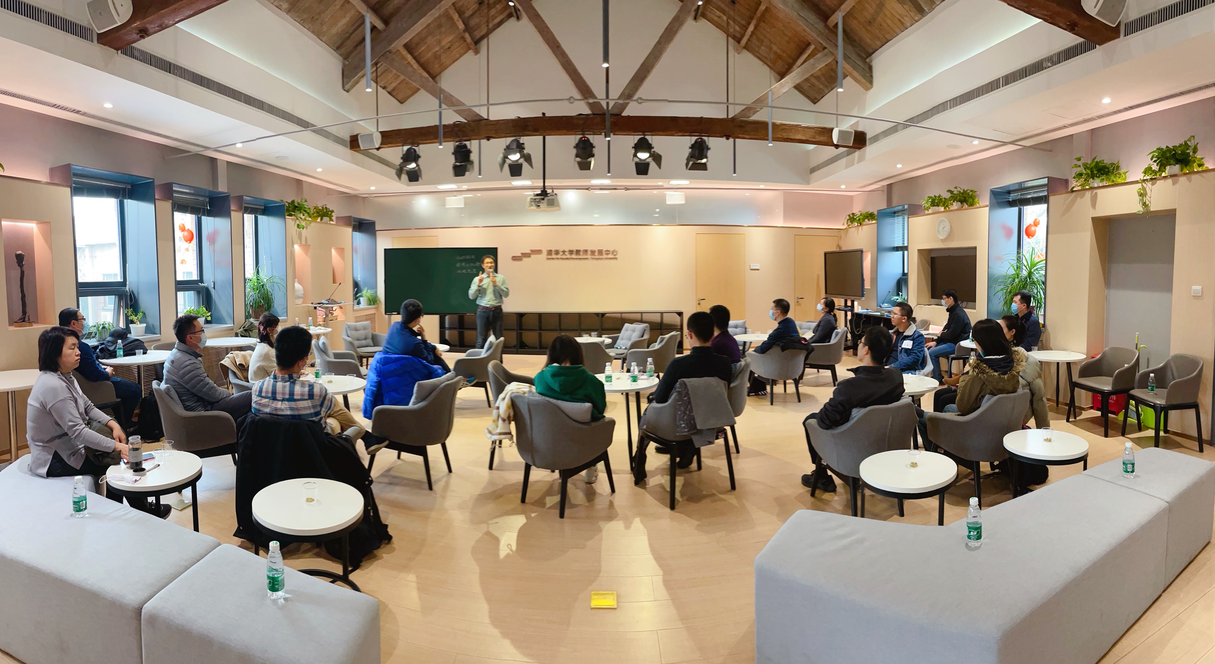 细心的参与者发现,活动开始前,每个小桌上都被摆上了葡萄干,随着活动进行到第三环节,贾坤开始引导大家“品尝”葡萄干。从观察葡萄干的形状与细致的纹理,到闻葡萄干的气味,再到倾听葡萄干的“声音”,最后慢慢品尝葡萄干的味道。教师们有的对着灯光观察葡萄干,有的放在耳边仔细聆听,有的触摸葡萄干的表面……大家都聚精会神地投入到活动中。贾坤鼓励大家从“身体感觉、想法、情绪”等方面觉察自己的情绪和压力反应。他又结合大家的工作压力,介绍了战斗或逃跑反应(Fight-or-flight response)的原理,建议教师们要觉察不良压力反应,在“战斗”与“逃跑”之间取得平衡,更智慧、更灵活地看待和应对压力。