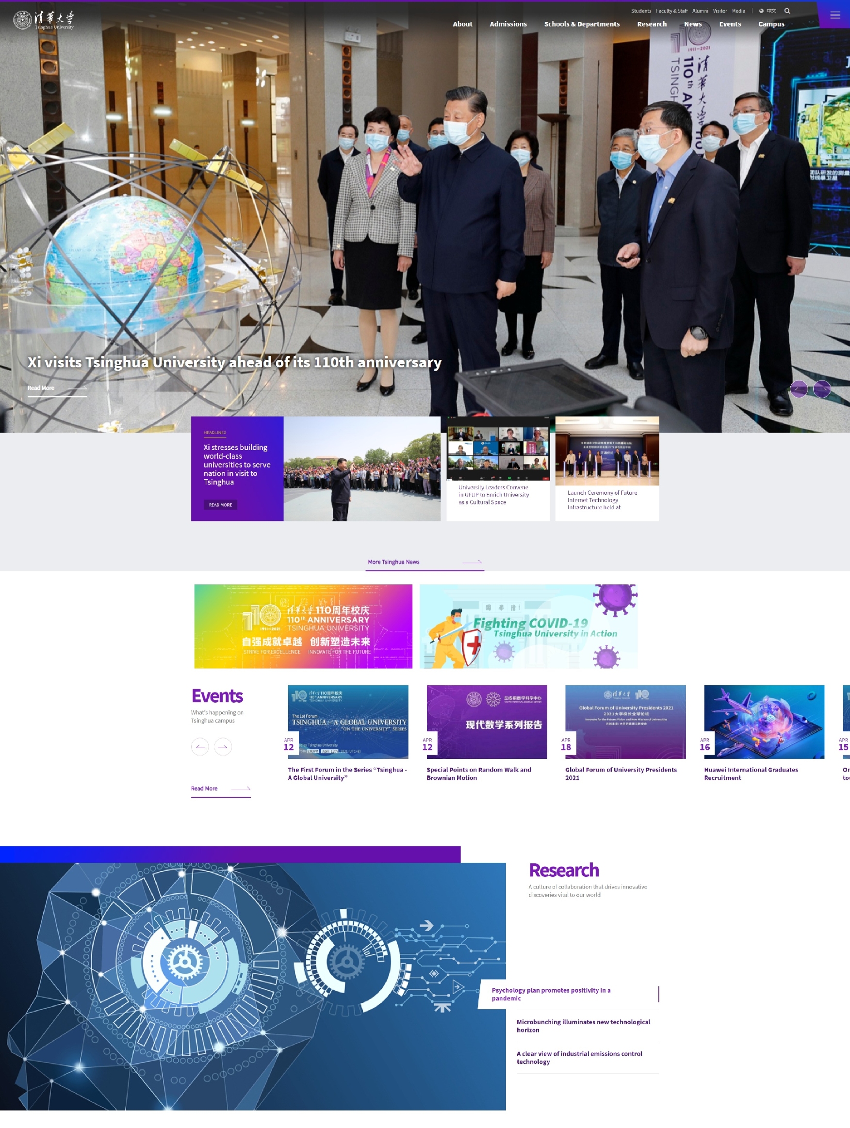 内容上,新版主页与新闻网实现融合,原清华新闻网改版为主页“清华新闻”栏目,并在主页核心位置呈现“头条新闻”“专题推荐”“媒体清华”等重要新闻资讯,主导航“教育教学”“科学研究”“合作交流”等栏目新增相关新闻动态。在主页首页上部最醒目的大幅区域,以短视频的形式生动展现大学新貌与精神文化,更突出学术科研、校园生活与招生内容。新增社交媒体板块,可一键直达各校级新媒体平台。功能上,新增不同用户群体入口,优化了智能搜索,实现了网站群平台信息精确检索。新增“站点地图”导航,实现内容快捷定位。全站采用响应式布局模式,满足不同用户设备终端,提升浏览体验。