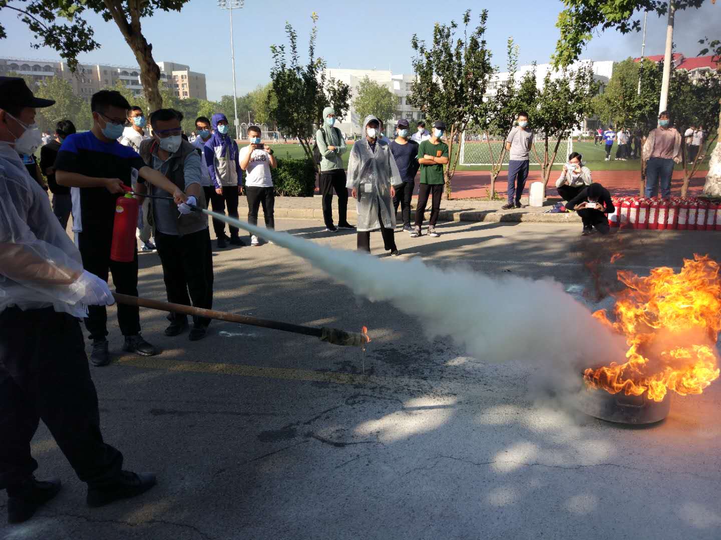疫情防控常态化背景下,学生社区德育助理、安全管理人员等现场工作人员均配备防护服及手套,做好灭火器演练服务保障准备工作。同学们在学生社区德育助理指导下,逐一进行灭火器实操。