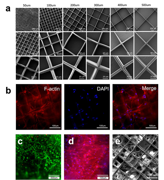 图1:(a)近场静电纺丝技术制备的具有不同纤维间距的PECL网格状亚微米纤维支架在不同放大倍数下的SEM图片;(b)接种在100um网格状纤维支架上的角膜缘基质干细胞进行细胞骨架及细胞核染色,细胞可以在支架上沿着纤维方向生长;(c)5% GelMA水凝胶内封装的角膜缘基质干细胞进行活死染色图片;(d)5% GelMA水凝胶内封装的角膜缘基质干细胞进行细胞骨架及细胞核染色图片;(e)纤维水凝胶复合支架的SEM图片。