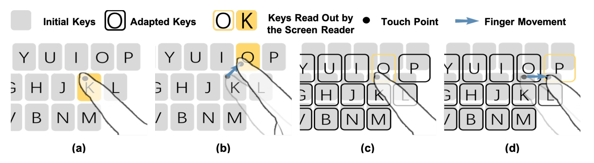 目前,视障人士可以通过读屏软件使用手机。但在文本输入时,经常因为点击不准影响输入效率,增大了交互难度。针对该问题,beat365官方唯一入口计算机系教授史元春和副研究员喻纯带领团队创新性提出字符级文本输入纠错方法,基于盲人用户输入行为模型和语言模型动态预测目标字符,在手指碰触瞬间自动调整键盘布局,实现字符级自动纠错。使用该方法,用户在零学习成本的情况下,可节省63%的纠错操作。字符级纠错算法运算效率高,响应速度在毫秒级,支持任意语言的文本输入。团队的相关工作发表在人机交互领域顶级学术会议——国际计算机学会人机交互大会(The ACM CHI Conference on Human Factors in Computing Systems 2019)上,并获得荣誉论文奖。