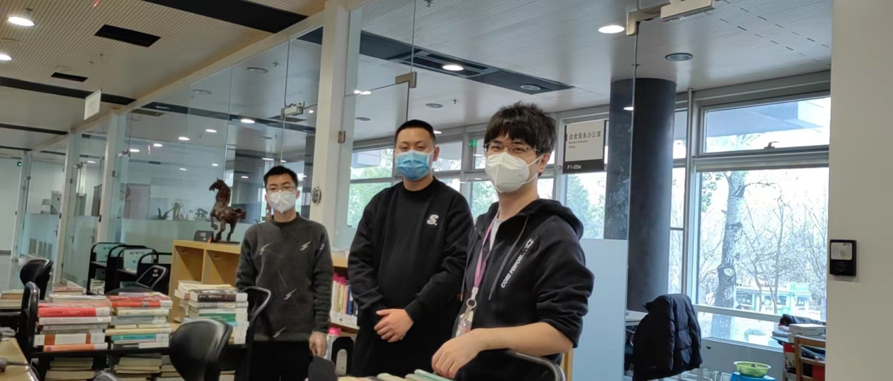 文科馆是同学们格外喜欢的自习场所,疫情期间仍保持较高的入馆人数和借还书量,在馆工作人员承担的业务量大,任务繁重。文科馆总服务台的吴晓飞主动承担了几乎所有晚班。年轻馆员贾虓涧和张帅、刘子正等外协人员一起,在多数同事不能到岗的情况下,身兼数任,除了负责借书、还书、咨询、保障总服务台流通外,还承担了落实入馆人员住处、发放物资等后勤工作,保障了自助文印业务的持续开展,以及配合学校流调等工作的开展。