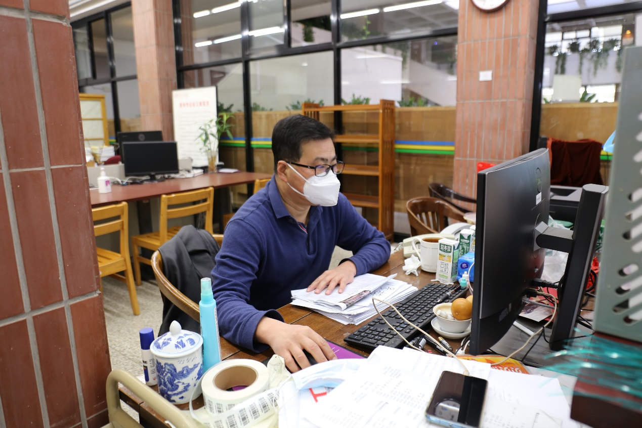 图书馆综合办公室副主任马安生也在第一时间驻馆。他忙于处理涉疫人员在图书馆的轨迹流调,长时间查看监控视频,确定相关人员在图书馆的活动轨迹、接触人员,配合学校流调工作的顺利开展。同时,物资配发、行政协调也是他的工作内容。