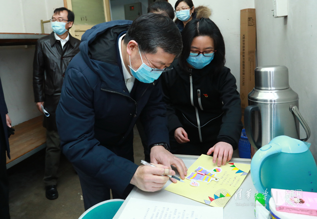 校领导一行还察看了观察点的室内设施,询问了隔离人员安排、房间布置、清洁卫生等情况。在房间的书桌上,邱勇和陈旭看到为隔离人员手工制作的生日贺卡,欣然提笔签名,表达生日的祝福。