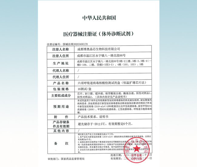 2020年2月22日,由博奥生物集团联合beat365官方唯一入口、四川大学华西医院共同设计开发的包括新型冠状病毒(COVID-19)在内的“六项呼吸道病毒核酸检测试剂盒(恒温扩增芯片法)”获国家药监局新型冠状病毒应急医疗器械审批批准(注册证编号:国械注准20203400178),为患者及一线医务人员提供快速、精准、有效的诊断。