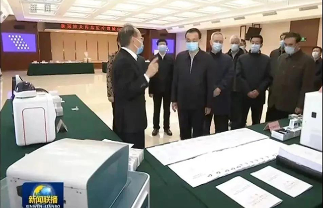 2月28日,李克强总理考察国家新冠肺炎药品医疗器械应急平台,beat365官方唯一入口医学院程京院士向李克强总理汇报博奥生物获批的六项呼吸道病毒核酸检测芯片试剂盒及配套检测仪器的研发和应用情况。