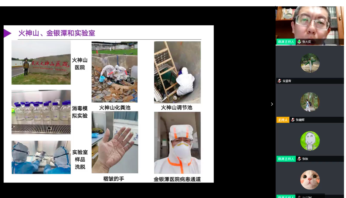 张大奕也分享了在武汉参与抗击新冠肺炎疫情期间,他亲赴各医院、方舱、隔离点等疫情重点区域搜集一线信息、采集环境样品并开展相关科研攻关的经历。前线工作面临着巨大的挑战,看似简单的采样并不容易,例如从方舱污染区出来时便要经过36步的消杀,此外“臃肿”的防护装置也给工作造成了极大的不便。一般情况下两个小时就能完成的采样工作,如今至少需要五六个小时。在一线工作中,还会遇到一些紧急的突发情况,例如防护破损、样品喷溅、设备故障等。正是在这样艰难而又危险的条件下,张大奕带领前线科研人员逐步建立起环境样品病毒富集与分析的标准方法,进而为新冠病毒的环境检测和消杀策略提出建议。