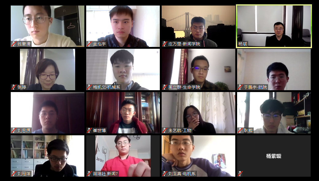 清华新闻网5月6日电 4月29日下午,副校长杨斌与来自机械系、生命学院、新闻学院等院系的13位在学校或院系学生会工作的同学,以线上视频会议的方式,开展了主题为“以生活而教育,因疫情而成长”的“开放交流时间”活动。校团委书记张婷参加活动。师生围绕疫情期间在家学习的感受和体验,畅谈这段“全民抗疫”特殊时光中的生活与成长。