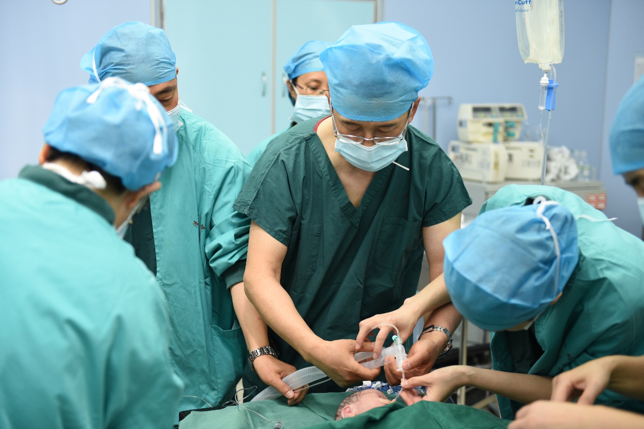 然而,紧张的时刻才刚刚开始!患儿哭声变得细弱,肤色青紫。时间就是生命,张东亚立刻指挥抢救,果断为患儿实施面罩辅助通气,麻醉医师立即为患儿进行气管插管保证通气,患儿血氧饱和度逐渐上升,肤色由紫转红,度过了第一个关卡。紧接着,儿科副主任刘淑芳和护士长张永梅为患儿进行脐静脉穿刺置管,李慧先迅速为患儿泵入肾上腺素,以提升心率,改善心功能。此时患儿心率稳定在50次/分钟左右,脉搏氧饱和度在95%左右。
