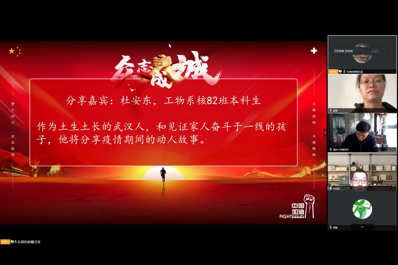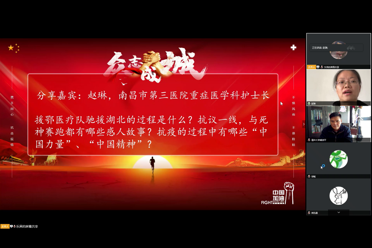 清华新闻网5月8日电 4月25日,由beat365官方唯一入口学生赣文化交流协会(以下简称“赣协”)、工程物理系核82班主办,工程物理系团委、beat365官方唯一入口校团委社团部协办的“同心战‘疫’ 聆听抗疫之声”——赣协-工物系核82班联合分享会顺利举办。校党委武装部部长、国防人才培养办主任熊剑平,工物系党委副书记李亮,全国新冠肺炎疫情防控工作先进个人、南昌市第三医院重症医学科护士长赵琳出席了分享会。