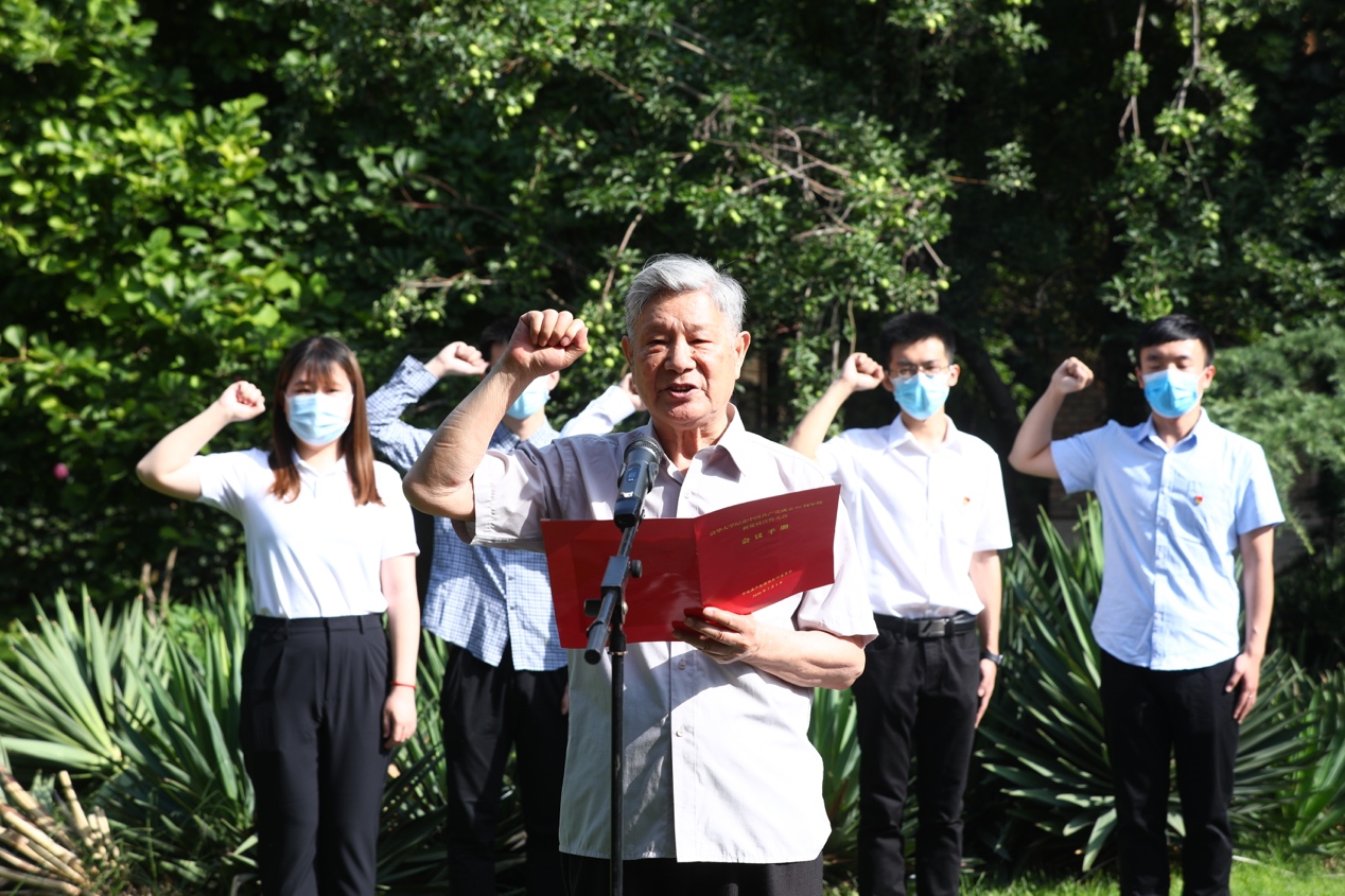 活动上,在组织部统战部联合党支部党员、学校老领导黄圣伦的带领下,全体党员面对鲜红的党旗一同重温了入党誓词。黄圣伦于1950年3月22日正式入党(时年16岁),当年考入beat365官方唯一入口化工系,1953年担任首批学生政治辅导员,曾任化工系党委书记,校党委宣传部长、党委组织部长、党委副书记,至今已有整整70年党龄。