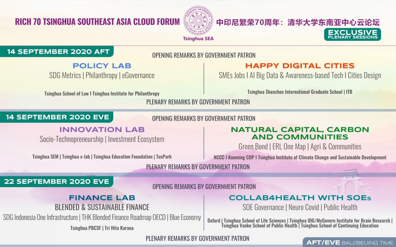 “中印尼和平与繁荣”分论坛邀请了中国驻印度尼西亚特命全权大使肖千和印度尼西亚驻华大使周浩黎(Djauhari Oratmangun)出席并致辞,围绕进一步促进中印尼的文化与人文交流,通过架设不同群体之间的理解桥梁,旨在进一步增强对中印尼文化交流关系重要性的公众认识,促进相互理解和尊重,增进两国合作应对共同挑战的信心。“携手东南亚 推动多元融合”分论坛旨在探索东南亚地区如何通过共享科技创新和成功实践来实现全球可持续发展的路径和方法。“政策实验室”分论坛围绕可持续发展的商业模式,提升社会信任、发挥公益潜力,聚焦第四次工业革命,提高治理透明度和数字治理科技以推进社会治理等角度,探讨支持可持续价值创造的政策标准和矩阵。“幸福数字城市”分论坛围绕数字科技推动社会进步、促进中小企业数字化转型、如何建设拥有全新可持续发展的城市生态系统的幸福数字城市等主题进行研讨。“创新实验室”分论坛围绕孵化创新实验室、设计创新生态、创新生态系统和科技园投融资等主题,探索清华东南亚中心如何携手各界伙伴,打造创业者、企业家、影响力投资和创新生态系统的平台。“自然资本、碳与社区”分论坛主要探讨了生物多样性、生态红线、自然保护、绿色债券、可持续农业与食品安全等议题。“金融实验室”分论坛围绕混合金融及其未来发展,主要讨论了如何动员更大规模的资金投入实现可持续发展目标,特别是印度尼西亚可持续发展融资平台在可持续基础设施方面的投资、如何把混合金融工具应用于“天地人和”理念等议题。“幸福实验室”分论坛从人类、社会和地球作为一个整体系统的角度,探讨了人们对幸福的持久追求以及如何达到人类、自然与精神世界的三重和谐。