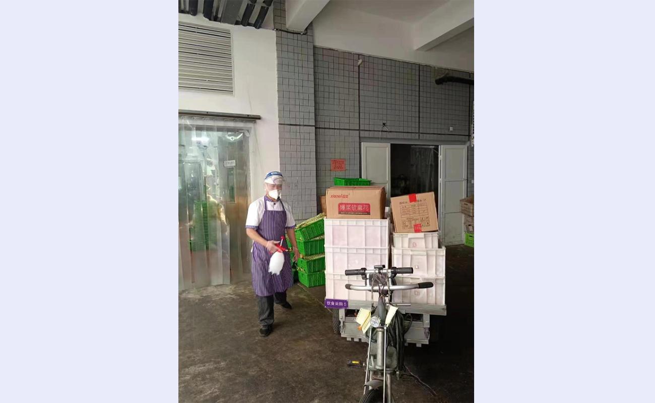 佩戴好手套、N95口罩和面罩,配置好消毒液,每一批货物都要经过仔细消毒和检查,再食堂入库……这一套流程他每天要重复数十次。