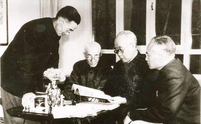“争取团结百分之百的教师”“一百单八将是清华的稳定因素”。图为梁思成、张子高、刘仙洲、施嘉炀(左起)等老教授们在一起学习交流。