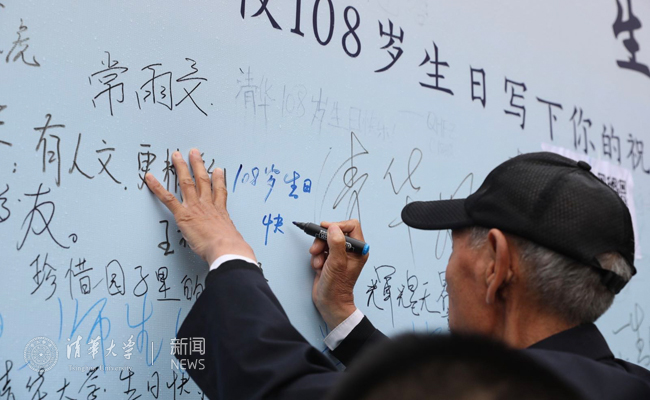 来到清华学堂前的“清华:一生有你”签名版前,蒋振夏认认真真地为母校写下一句祝福:“108岁生日快乐!”。