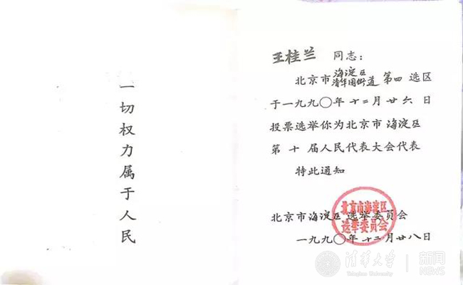 正是因为王桂兰无悔的付出和无私的爱,她被清华的同学们选为1990年海淀区人大代表。“我一开始都不知道,同学们就把我提名为人大代表了。那时候都是学生出代表,研究生也有代表,选了我就占了一个学生的名额。后来孩子们跟我说,‘王妈妈,我们就想选你,你能代表我们!’”