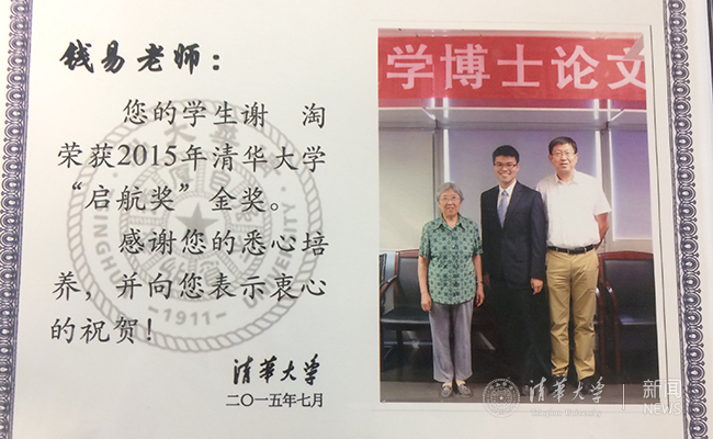 提到学生,钱易老师很激动,她站起来,走到书柜边,小心翼翼地从里面翻出一个纪念证书。这是清华2015级启航金奖的获得者,也是钱易和环境学院教师汪诚文合作培养的博士生谢淘。谢淘科研做得很优秀,博士生毕业时,有许多研究机构想要聘请他,钱易更是打算推荐他去美国读博士后。但他却毅然选择了回到江西老家做了一名基层的干部。“他真的让我很意外,也特别感动。”钱易望着证书上的学生,满脸的骄傲和自豪。