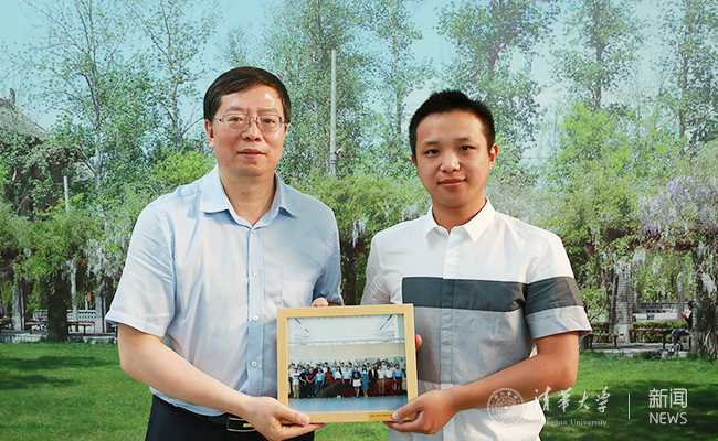 邱勇向从军报国的自动化系硕士毕业生沈文祎赠送合影。记者 苑洁 摄