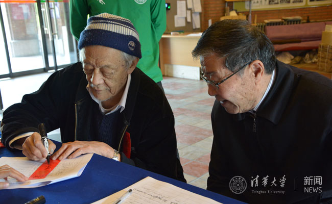 诸国祯(1949级物理)为李庆忠(1949级物理)写校友红条。  骆洁 摄