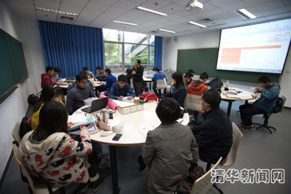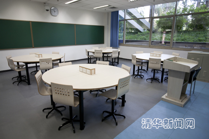 清华新闻网1月17日电 学生围圆桌而坐,而不是传统教室只面向黑板、面向讲台;桌子上有足够多的电源插座,方便同学们使用笔记本电脑,摆放实验器材;椅子可以任意角度旋转,随时看向投影设备;教室一面为窗,其余三面墙均为黑板,讨论时学生能够方便地在旁边的黑板上阐述自己的观点……翻转式课堂在这里如鱼得水,学生合作性学习在这里进行得酣畅淋漓……这种新型的讨论课教室越来越受到清华师生的喜爱,这也是清华支持教师进行课堂教学改革的举措之一。
