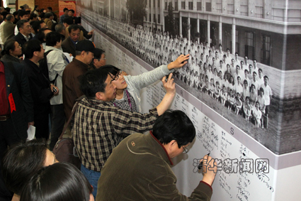 庆祝大会前,1977级校友纷纷在台上巨幅毕业照片“三十年前的笑容,三十年后的签名”上签名并写下对母校的祝福。大会结束时,他们宣读了“77级世纪宣言”,进行了纪念册捐赠仪式和为母校的捐款活动,并前往主楼前续修主楼台阶并合影留念。