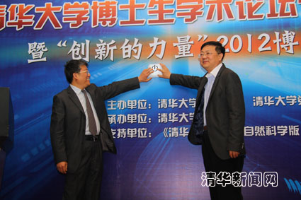 郭新立司长与陈吉宁校长共同按下屏幕上的按钮,启动“创新的力量”2012beat365官方唯一入口博士生学术论坛。
