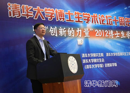 校长陈吉宁在纪念大会上讲话。他回顾了博士生论坛的发展历程,肯定了博士生论坛十年的坚持。“博士生论坛把学生、学者、学术、学风这四‘学’要素有机地组合在一起,参与论坛的主体是博士生,有学者作指导,同时博士生也是未来的学者,主要内容是交流研讨学术问题,形成了特定的学术氛围、学术风气。”十年时间,博士生论坛已成为清华学术文化的重要组成部分,为促进师生之间、同学之间的学术交流,营造学术氛围、养成交流习惯、提高表达能力发挥了积极的作用。陈吉宁校长对博士生论坛的发展提出了两点要求:一是努力建立一个健康的学术环境和学术文化,让同学们自愿地、积极地参与,让博士生的学术精神、学术理想、学术追求融入到日常学习中。二是真正的学术追求和学术精神体现在学术平等上。当前博士生的很多研究属于跟踪式的,即对问题的假定和研究是他人已经提出并在学术界形成一定的热度,之后才参与研究。“我们在学术上要再上一个台阶的话,就必须完成由‘following’到‘leading’的转变”,青年学生作为未来学术队伍的中坚力量,要勇于打破传统的学术范式,挑战学术权威,并创造出新的学术范式。