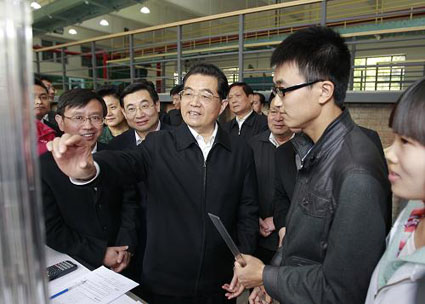图为胡锦涛在校史馆同部分将到边远地区和国防建设一线工作的应届毕业生亲切交谈。新华社记者兰红光摄