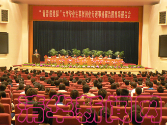 【新闻中心讯 研通社记者 龚维幂】4月14日上午,清华研究生团委组织部分研究生代表参加了在人民大会堂小礼堂举行的“青春的选择”大学毕业生基层创业先进事迹报告团首场报告会,报告会由共青团中央、中组部、中宣部、教育部、人事部、全国学联共同举办。 报告会开始前,中共中央政治局委员、全国人大常委会副委员长王兆国在大会堂陕西厅与报告团8位成员,以及清华和北大的同学进行了座谈。
