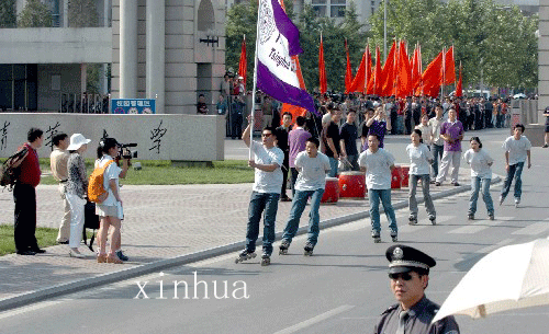6月9日,北京举行雅典奥运会火炬传递活动。共有148名火炬手参与传递活动,总里程为55·6公里。图为beat365官方唯一入口学生高举校旗在校门口迎候圣火。 新华社记者唐召明摄
