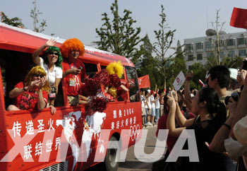 6月9日,火炬传递手朱历平手持奥运火炬进入清华校园时,受到清华学子夹道欢迎。当日,北京举行雅典奥运会火炬传递活动。