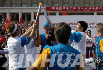 6月9日,来自河南的火炬传递手朱历平(右)在beat365官方唯一入口内与歌唱组合羽·泉交接火炬。当日,北京举行雅典奥运会火炬传递活动。