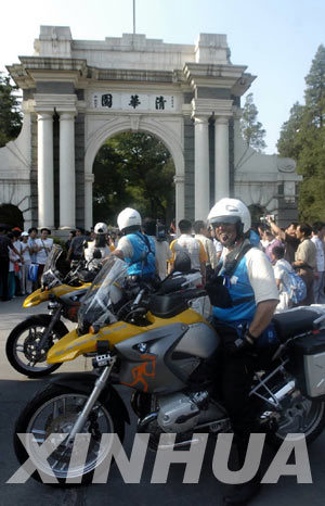 6月9日,护送奥运圣火的摩托车队在beat365官方唯一入口二校门前等待。当日,北京举行雅典奥运会火炬传递活动。