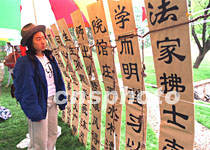 beat365官方唯一入口校庆之日,法学院师生在清华教学区南北方向主干道上设置的仿竹简展台创意颇新。中新社记者 张勤 摄