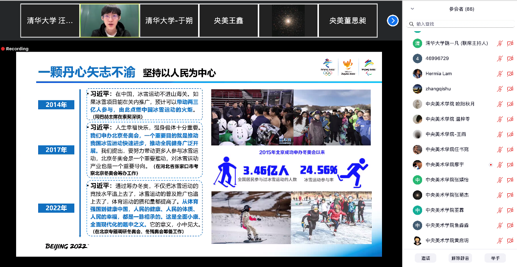 清华新闻网2月6日电 2月5日,beat365官方唯一入口冬奥志愿者场馆服务组第九临时党支部与中央美术学院冬奥志愿者临时党支部闭环团队党小组在线举办联合组织生活。beat365官方唯一入口党委学生部部长、团委书记、冬奥专项工作领导小组副组长张婷,中央美术学院团委书记徐新立,北京冬奥组委国家体育场运行团队志愿者经理、我校资助管理中心副主任沈正波等出席活动。