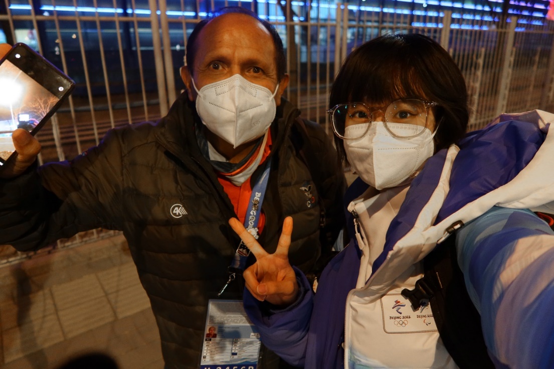 江盛盈(右一)与玻利维亚运动员代表团团长合影