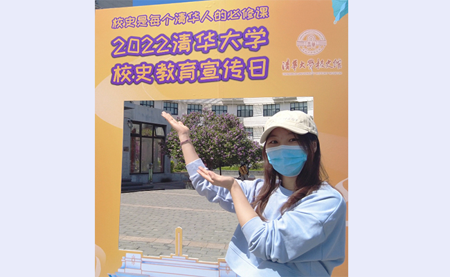 自拍集赞区域也吸引了不少师生。位于活动现场的南北两侧,各有一个一人多高的自拍相框板,上面印有本次校史教育宣传日的主题:“校史是每位清华人的必修课”,下面印有二校门手绘图案和紫苑学会形象人物。同学们在自拍相框板后拍照集赞,可以兑换精美的清华纪念书签一套。