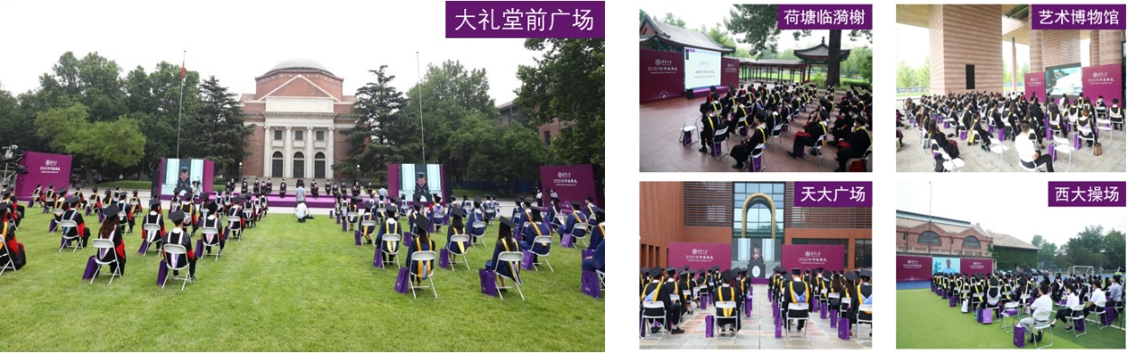 2020年,面对突如其来的新冠肺炎疫情,学校反复调研,创造性地提出“整个校园都是毕业典礼现场”的工作思路,首次采取“校园室外多会场+云上”的形式组织毕业典礼,在校内组织16处会场,并同时进行全球中英文双语直播。对受疫情影响不能到校的同学,学校许下承诺:可在今后任意一年返校参加学位授予仪式,弥补未到现场的遗憾。