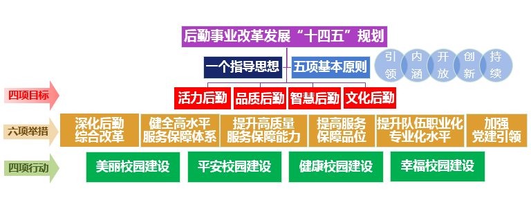 明晰后勤综合改革与发展路径,加强顶层设计和规划引领,统筹考虑学校事业发展战略目标和后勤现阶段承载能力,坚持事业规划与队伍规划同步制定、校园规划与学科规划有效衔接、综合改革与事业发展规划协同实施。按照工作范围和时间两个维度分解制定工作任务,科学描绘改革与发展蓝图。实施过程中狠抓任务落实,年度层层推进,确保推动改革力度始终不减。结合后勤优良传统和相关行业规律,坚持体系化整体推进基本建设、项目管理、服务保障等工作,与学校同步发展、融合发展。