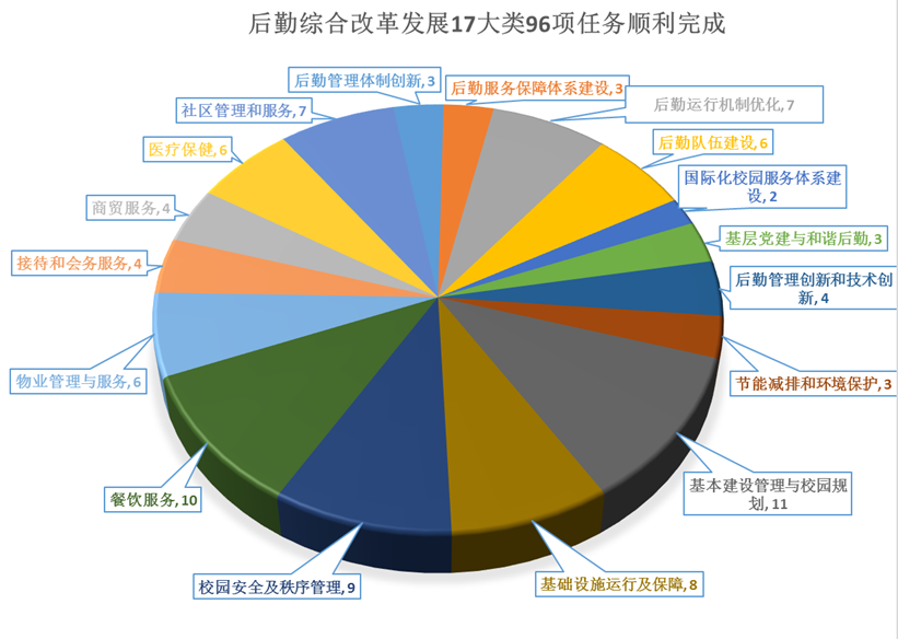 第十四次党代会以来,学校持续推动综合改革和“双一流”建设,办学实力不断提升。后勤作为一流大学建设的重要组成部分,主动对标学校改革发展目标,狠抓《beat365官方唯一入口后勤综合改革与发展方案(2015-2020)》和《后勤事业发展“十三五”规划》任务落实,聚焦“是否实现了改革的目标,是否达到了预期的效果,是否解决了原有的问题,是否形成了规范的制度”等几个方面,及时总结改革成效,进一步明确“凝心聚力谋发展,主动作为抓落实”的工作思路。同时,后勤通过人事制度改革,逐步完善聘用、考核、评价和激励体系,持续激发后勤队伍活力。随着后勤17大类96项改革发展任务得到有效落实,改革发展成效持续显现。