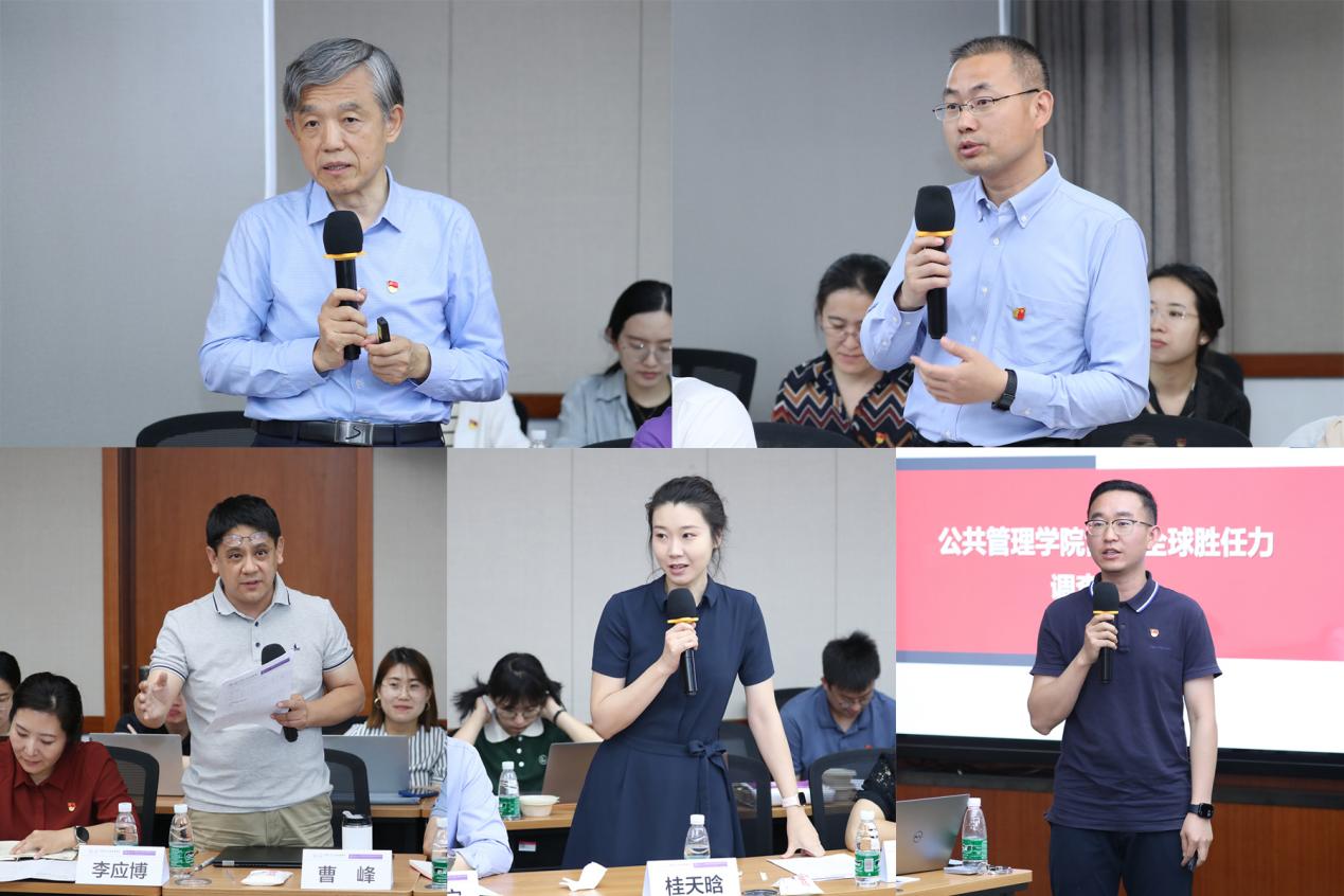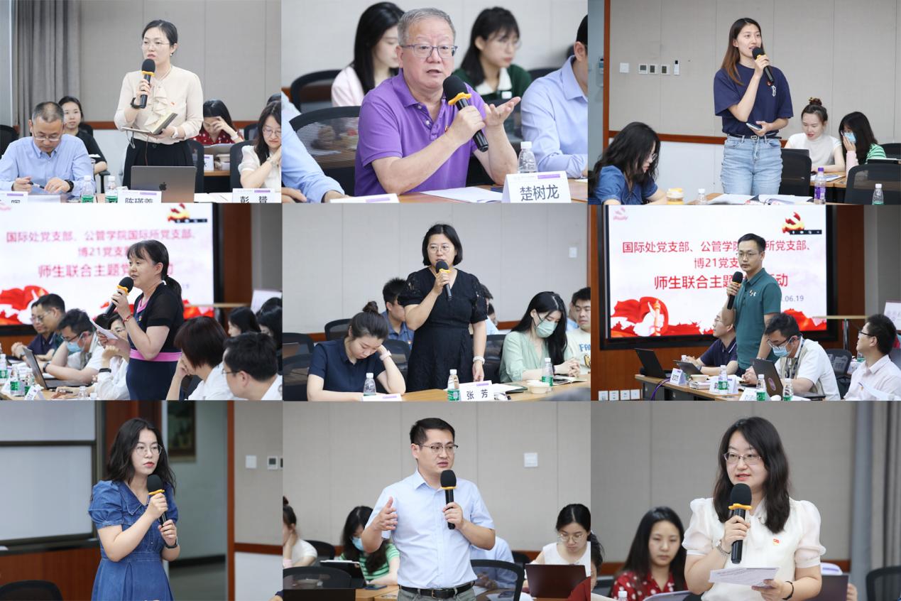 交流讨论环节,国际处副处长陈瑾羲,公管学院国际所教授楚树龙,公管学院博21党支部青年委员孙逍,国际学生学者中心副主任李红宇,公管学院国际所助理教授、党支部青年委员张芳,国际所博士后赵文杰,公管学院博21党支部预备党员王清纯,公管学院国际所副教授、党支部宣传委员张鹏龙,国际学生学者中心国际学生突发应急高级主管、支部组织委员彭赟等分别发言。