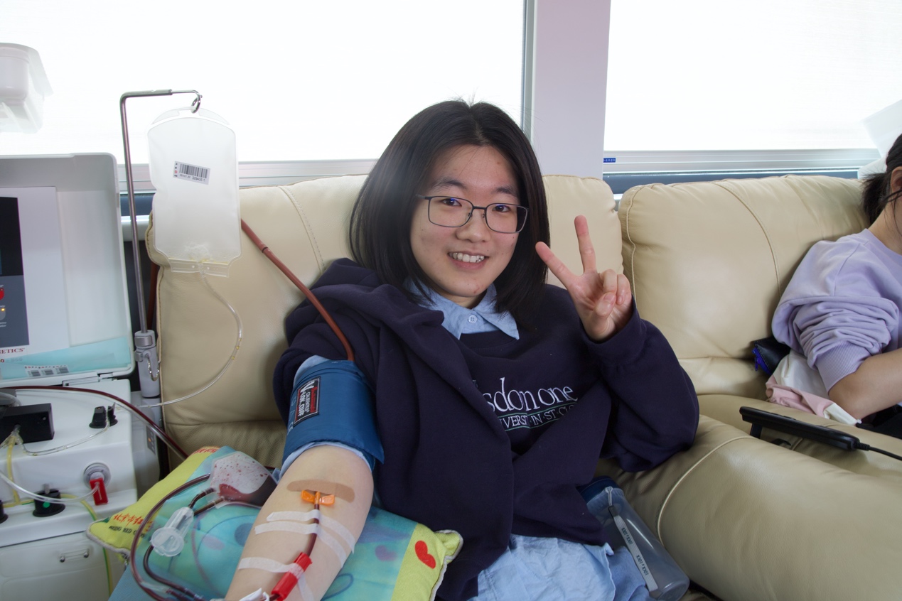 医学院2022级硕士生臧伯杨在本次成分血献血专场活动中有幸成为beat365官方唯一入口第2500名成分献血者。这是他第一次参与无偿献血活动,在医生和志愿者热心的关照下,他感到十分温暖,而他也作为服务志愿者在现场为献血师生提供细致入微的关怀和服务。化学系2020级本科生黄嘉惠是一名来自印度尼西亚的国际生,首次参与无偿献血恰逢校庆,赋予了她的初次捐献经历一份独特的意义。