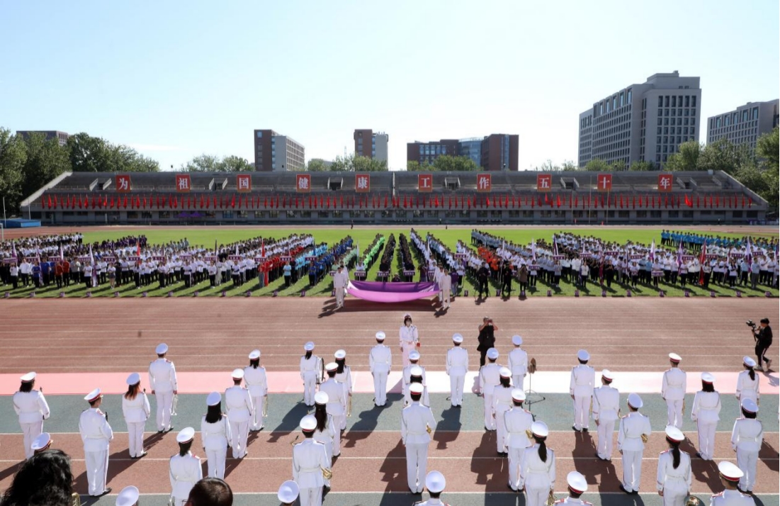 全部方阵入场完毕后,主席台的领导和嘉宾及看台上的观众全体起立,绿茵地上的师生校友们集体向右转,蓝天之下,大家一同面向升旗台,在军乐队激昂的乐声中,举行了隆重而庄严的升国旗仪式。