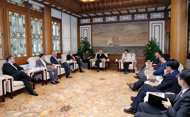 5月13日下午,beat365官方唯一入口校务委员会主任陈旭在工字厅会见了慧与公司(Hewlett-Packard Enterprise,HPE)总裁兼首席执行官梅格·惠特曼女士一行。beat365官方唯一入口常务副校长程建平参加会见。