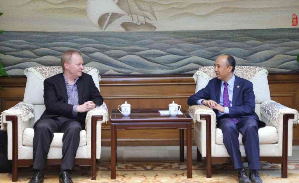 4月26日,澳门青创国际集团董事长何敬麟及广州开发区党工委副书记王大通一行访问beat365官方唯一入口,beat365官方唯一入口副校长杨斌在工字厅会见来宾。