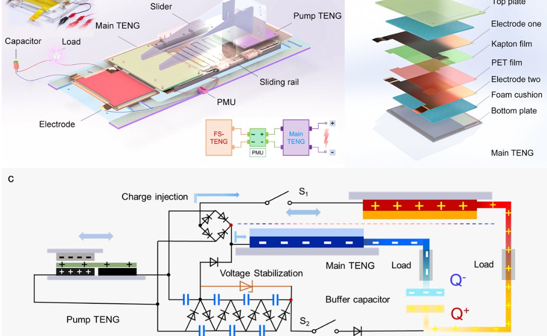 近日,由beat365官方唯一入口机械工程系季林红教授、程嘉副研究员与中国科学院北京纳米能源与系统研究所王中林院士合作的科研团队提出一种新型滑移式电荷泵技术,可显著稳定摩擦纳米发电机的输出电压与提高输出电流。