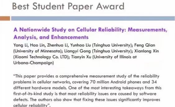 信息学院刘云浩教授和李振华副教授团队一直致力于移动网络关键技术研究。近日,在计算机网络通信领域国际顶尖会议之一ACM SIGCOMM上,团队的研究论文《蜂窝网络可靠性的全国性研究:测量、分析和增强》获得本届会议唯一的最佳学生论文奖。这是SIGCOMM首次...