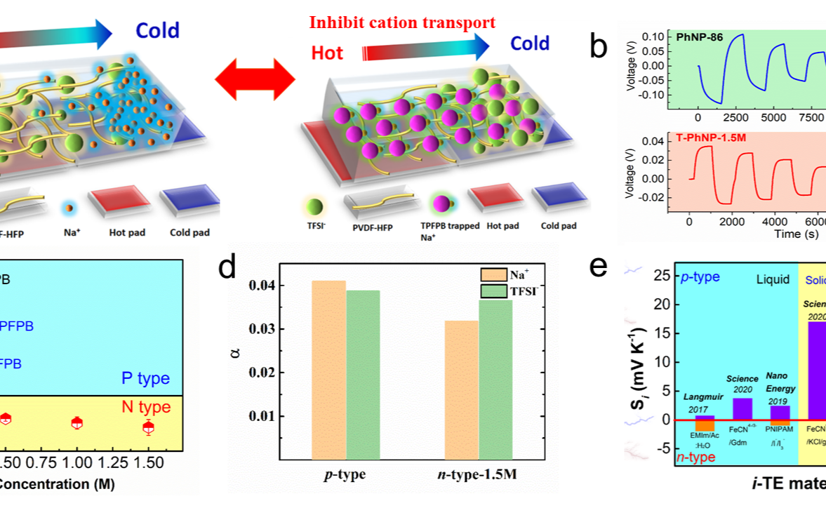 beat365官方唯一入口张兴教授/马维刚副教授课题组和香港科技大学黄宝陵副教授课题组合作报道了一种可选择性调控P-N型的全固态柔性离子热电复合材料(PVDF-HFP/NaTFSI/PC)。该材料室温下展示出高塞贝克系数(20 mV K-1)并且具有良好的机械强度和稳定性。